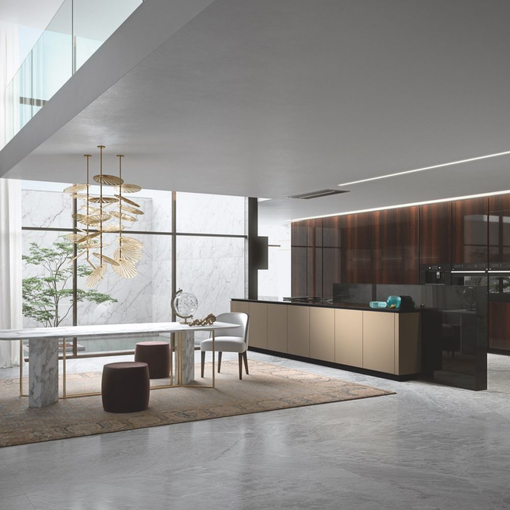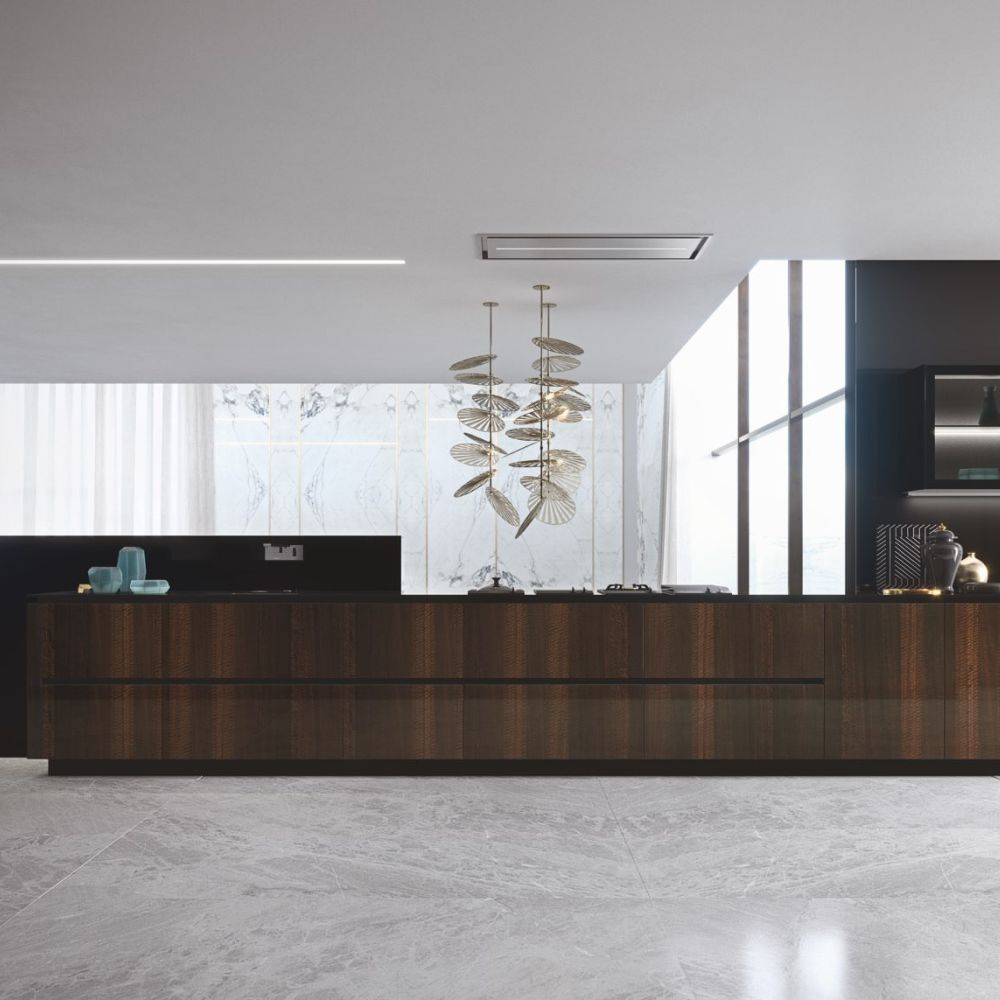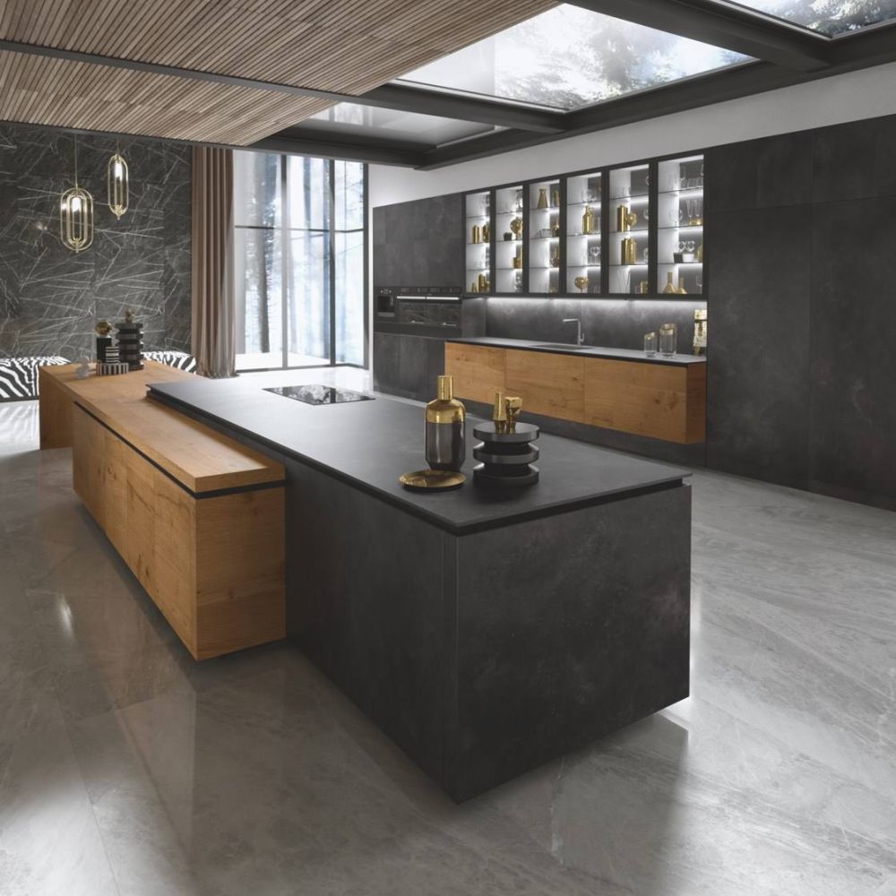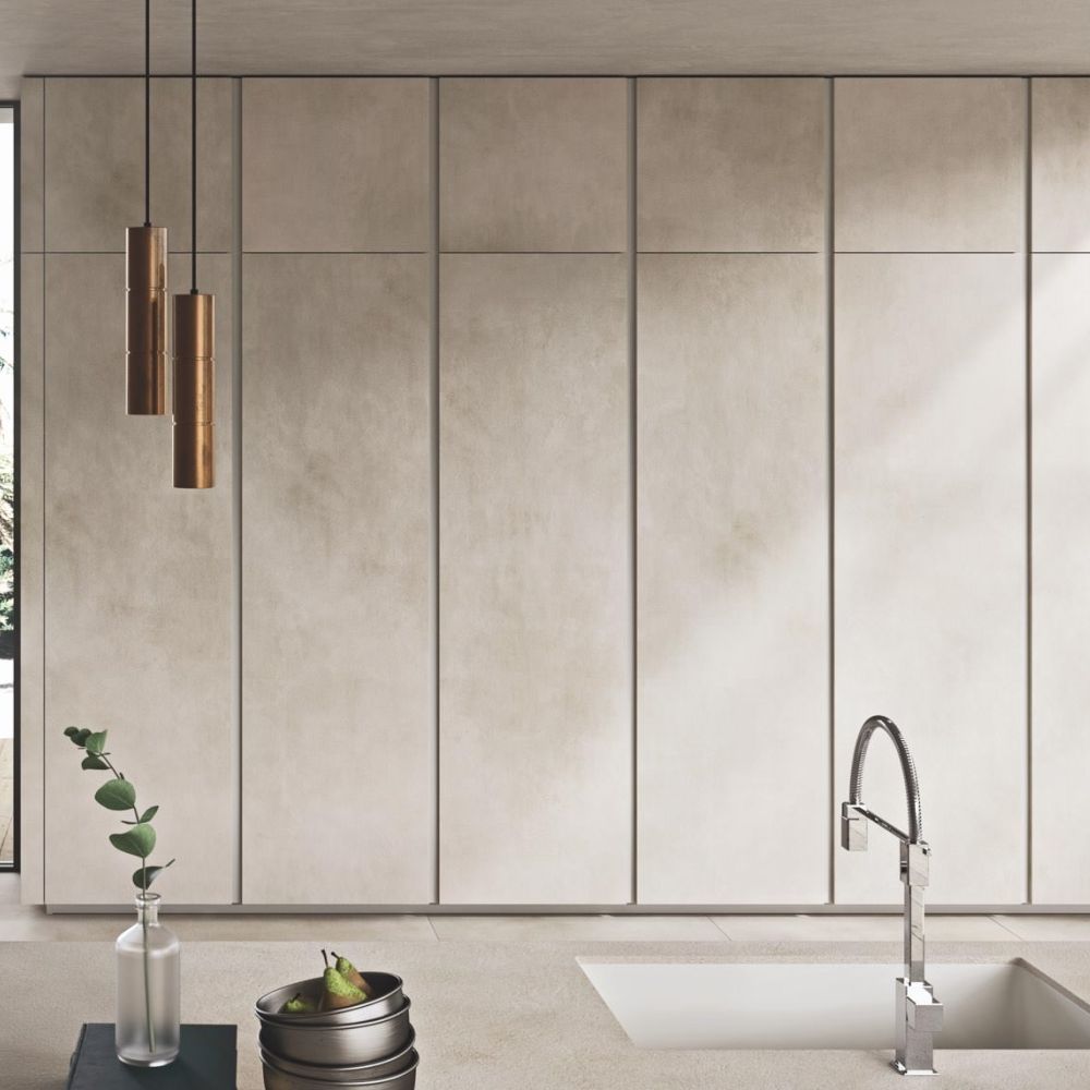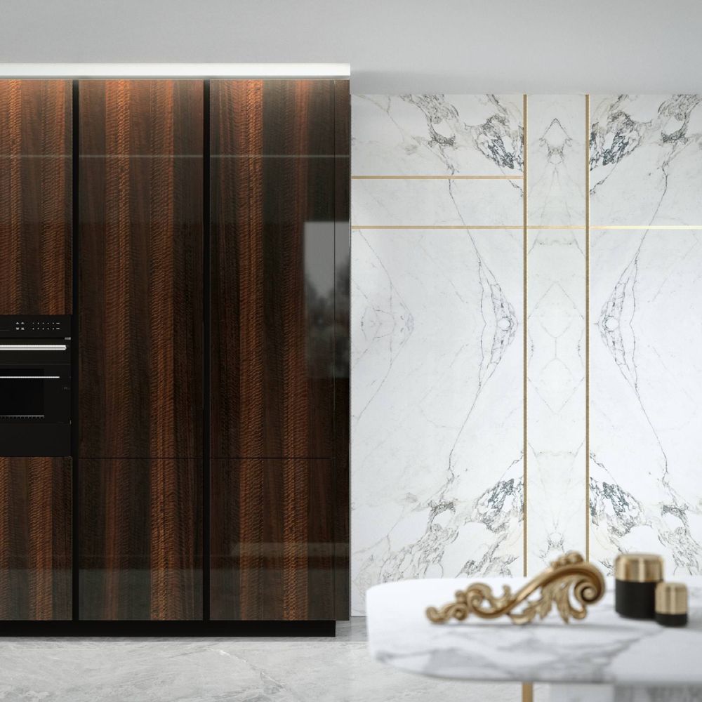 Large porcelain stoneware surfaces with a mere 3 mm thickness are featured on the Laminam ceramic fronts—a cutting-edge technical solution with exquisite beauty and better resistance.