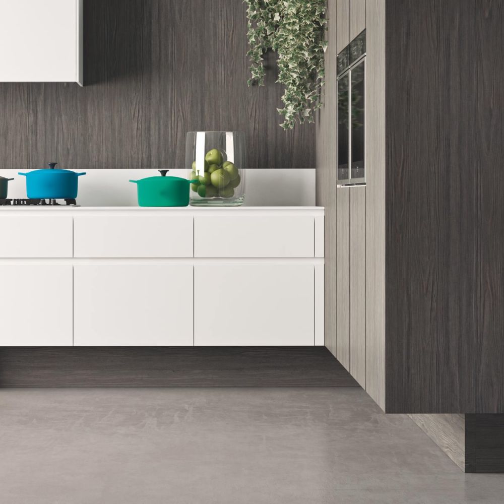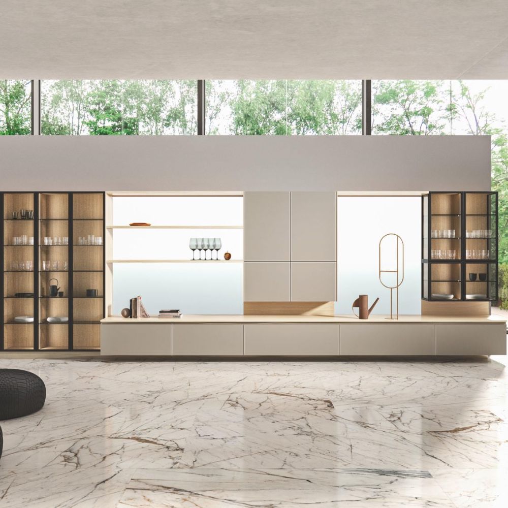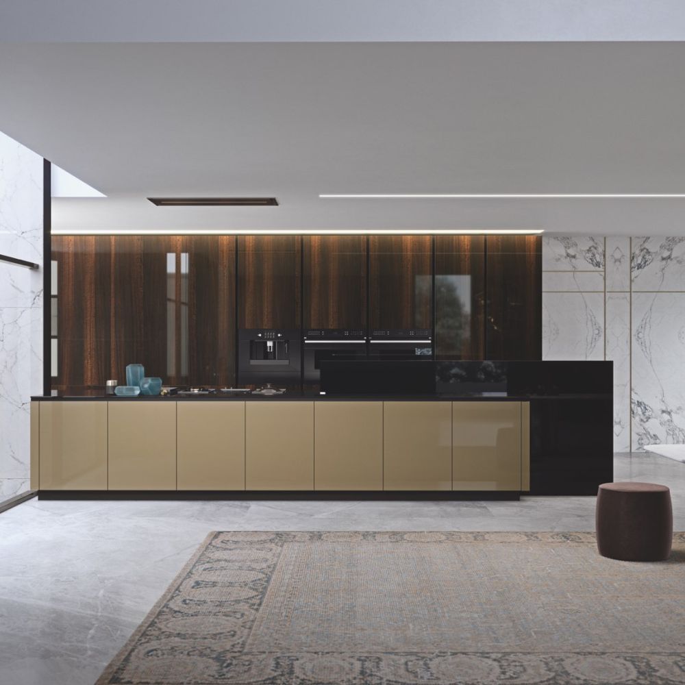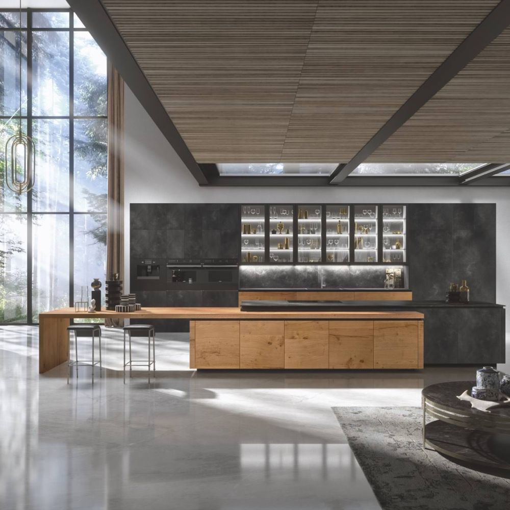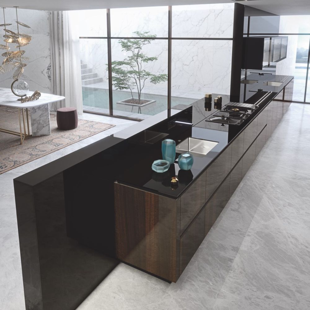 Large porcelain stoneware surfaces with a mere 3 mm thickness are featured on the Laminam ceramic fronts—a cutting-edge technical solution with exquisite beauty and better resistance.