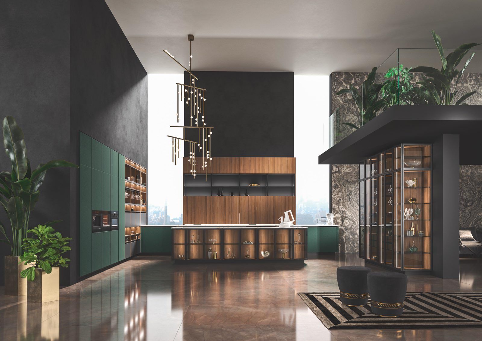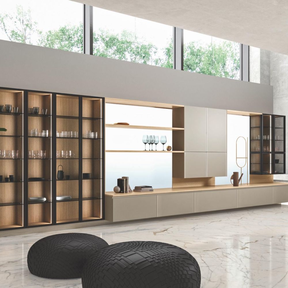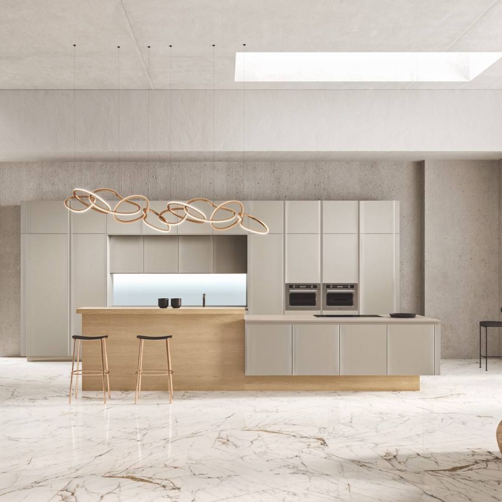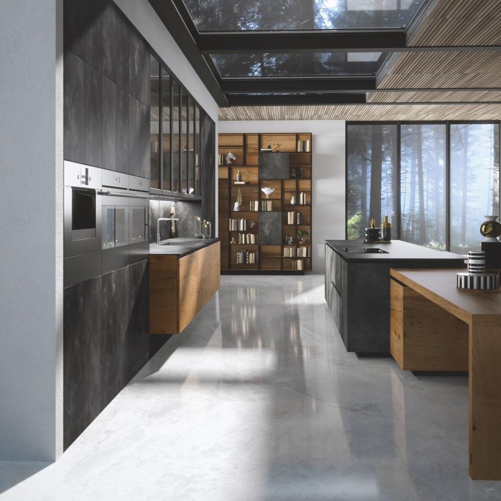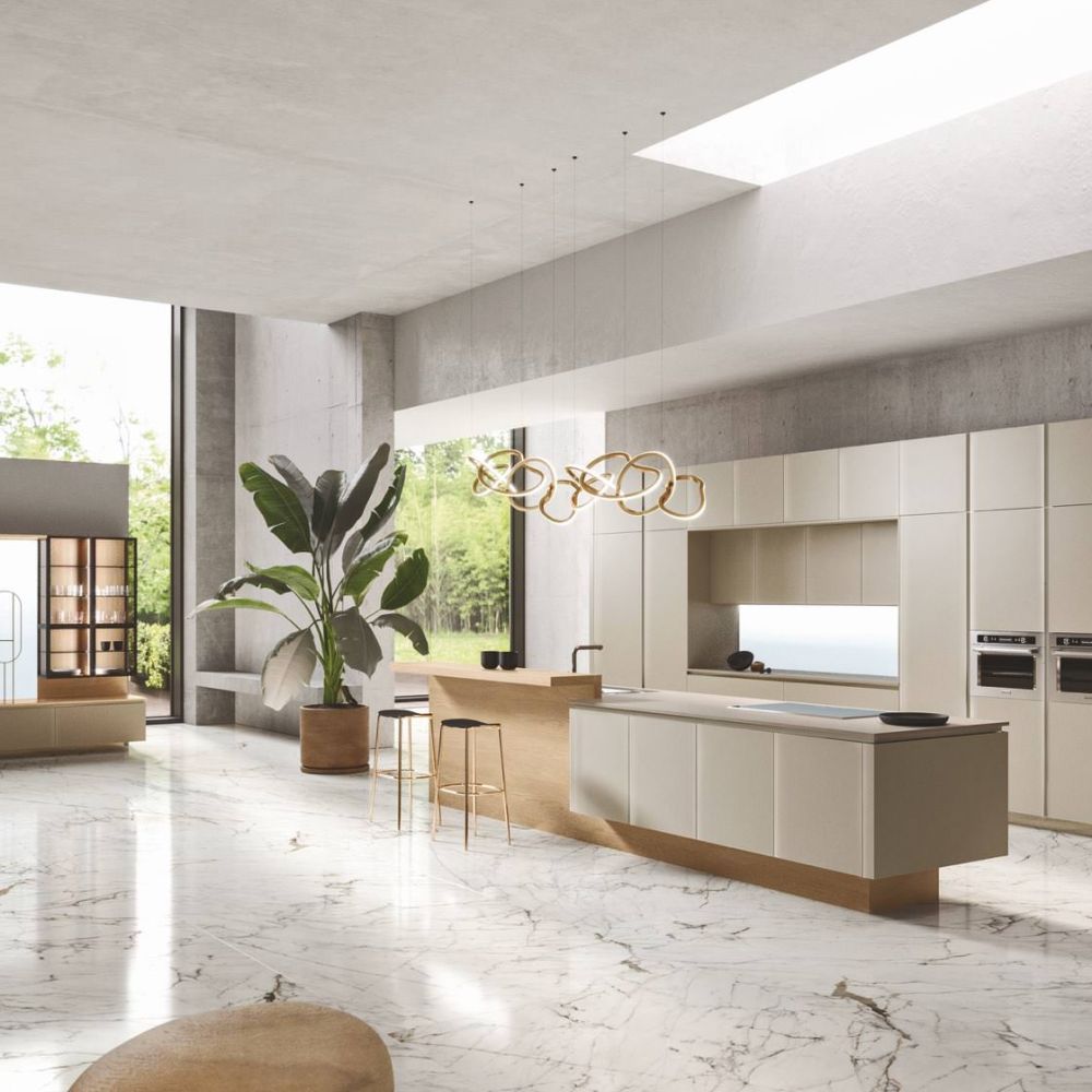 Large porcelain stoneware surfaces with a mere 3 mm thickness are featured on the Laminam ceramic fronts—a cutting-edge technical solution with exquisite beauty and better resistance.