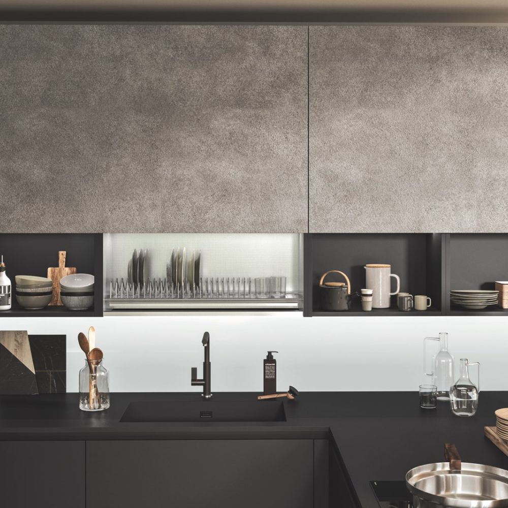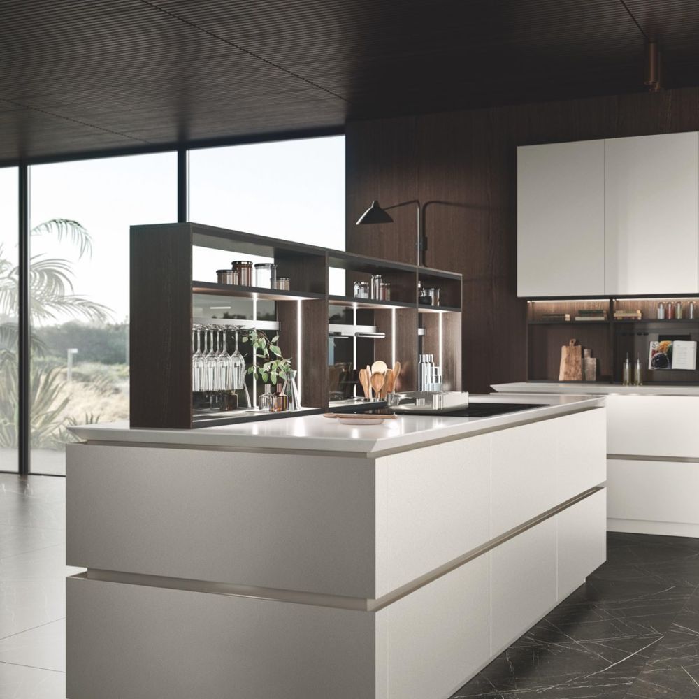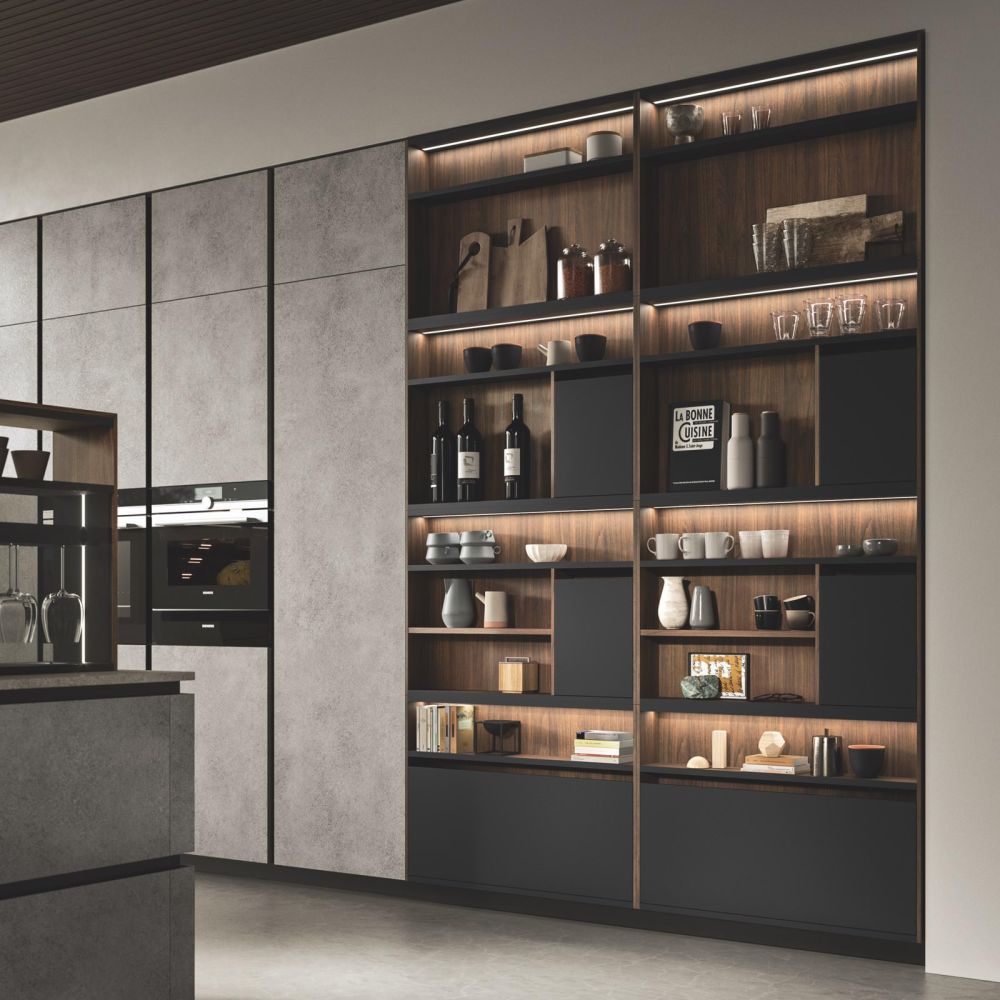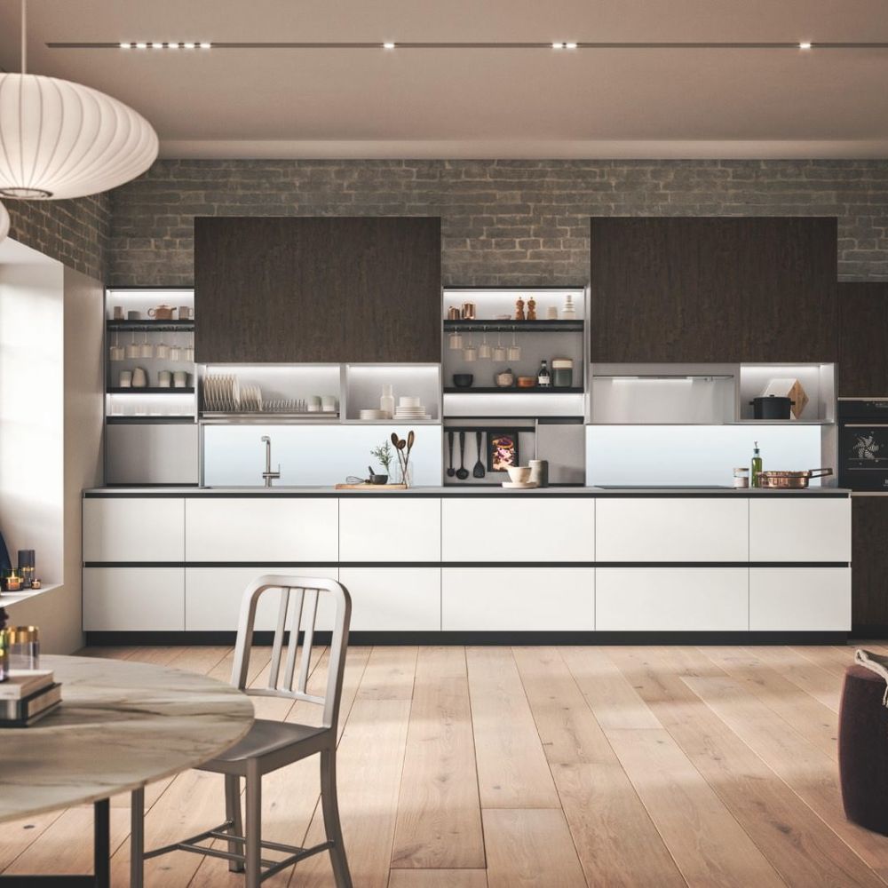 By selecting the same finish as the fronts, the worktop surface may be customized, making the layout look cohesive. The area becomes the focal point of a series of solids and voids as a result of the monolith effect’s pure aesthetics, which also highlights the space’s crisp geometric lines.