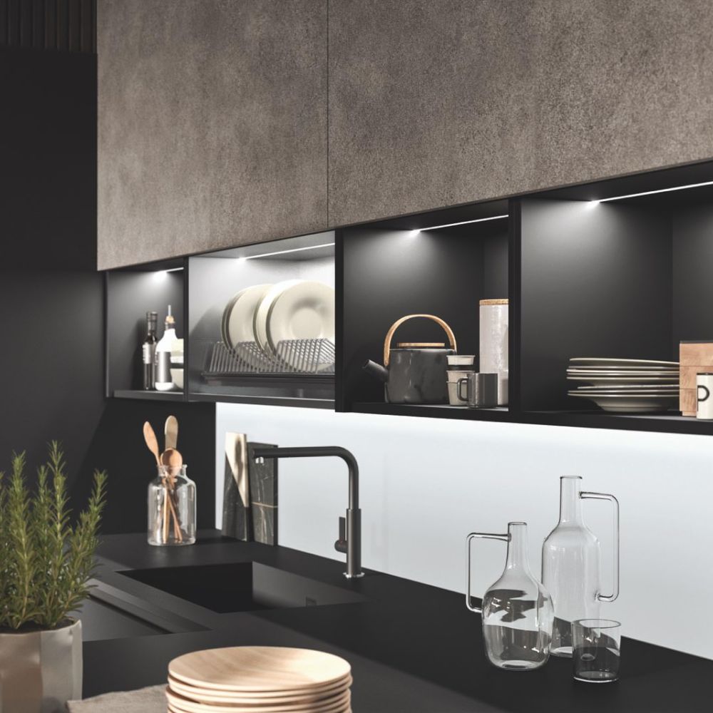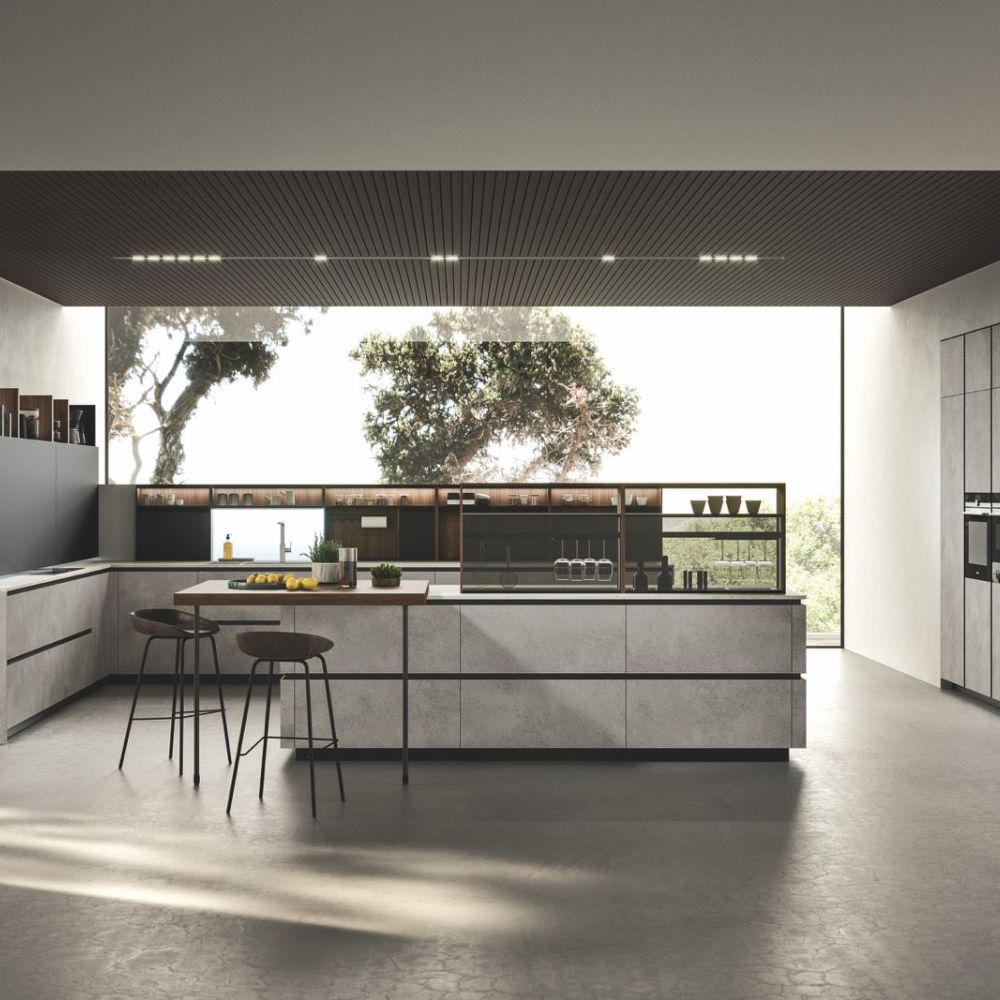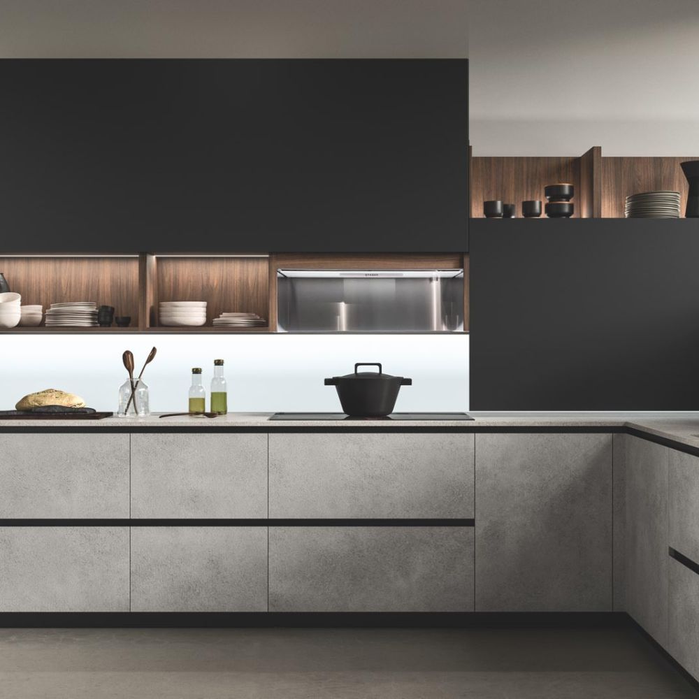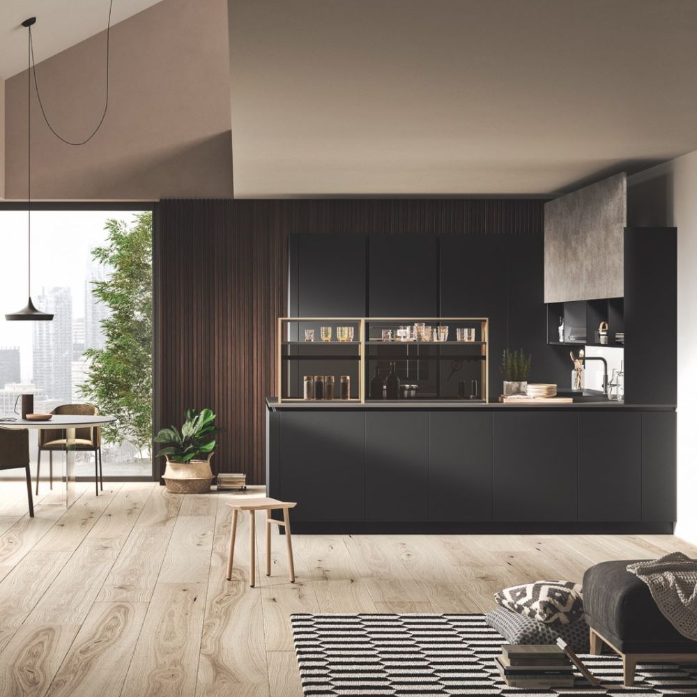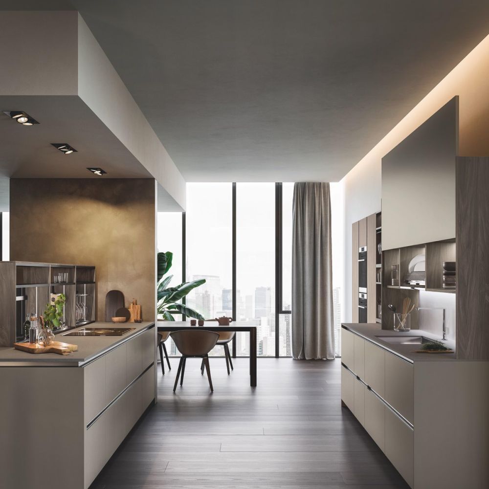 By selecting the same finish as the fronts, the worktop surface may be customized, making the layout look cohesive. The area becomes the focal point of a series of solids and voids as a result of the monolith effect’s pure aesthetics, which also highlights the space’s crisp geometric lines.