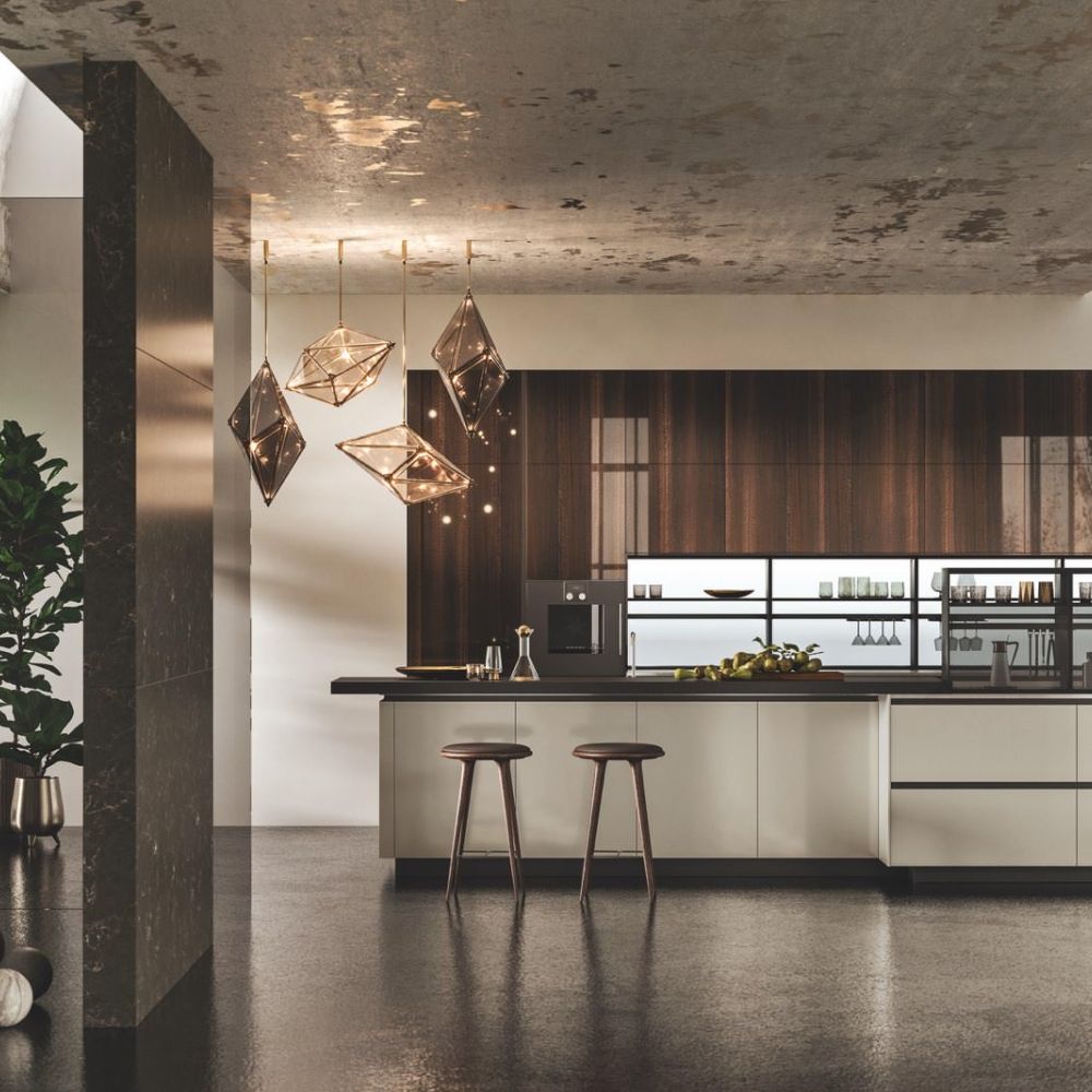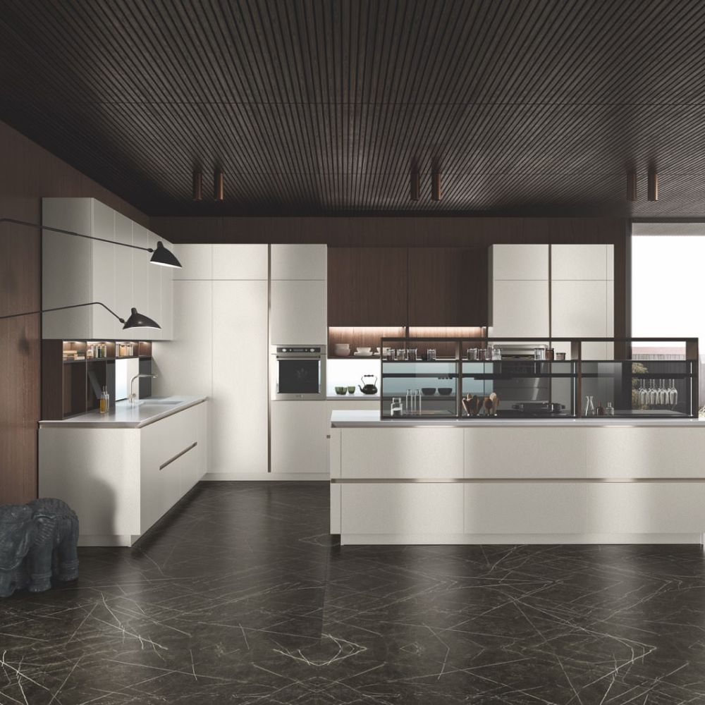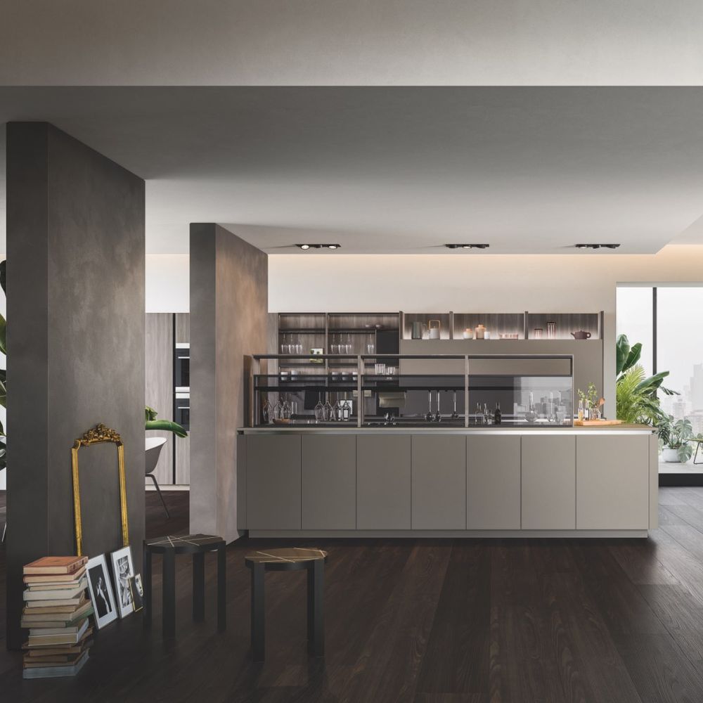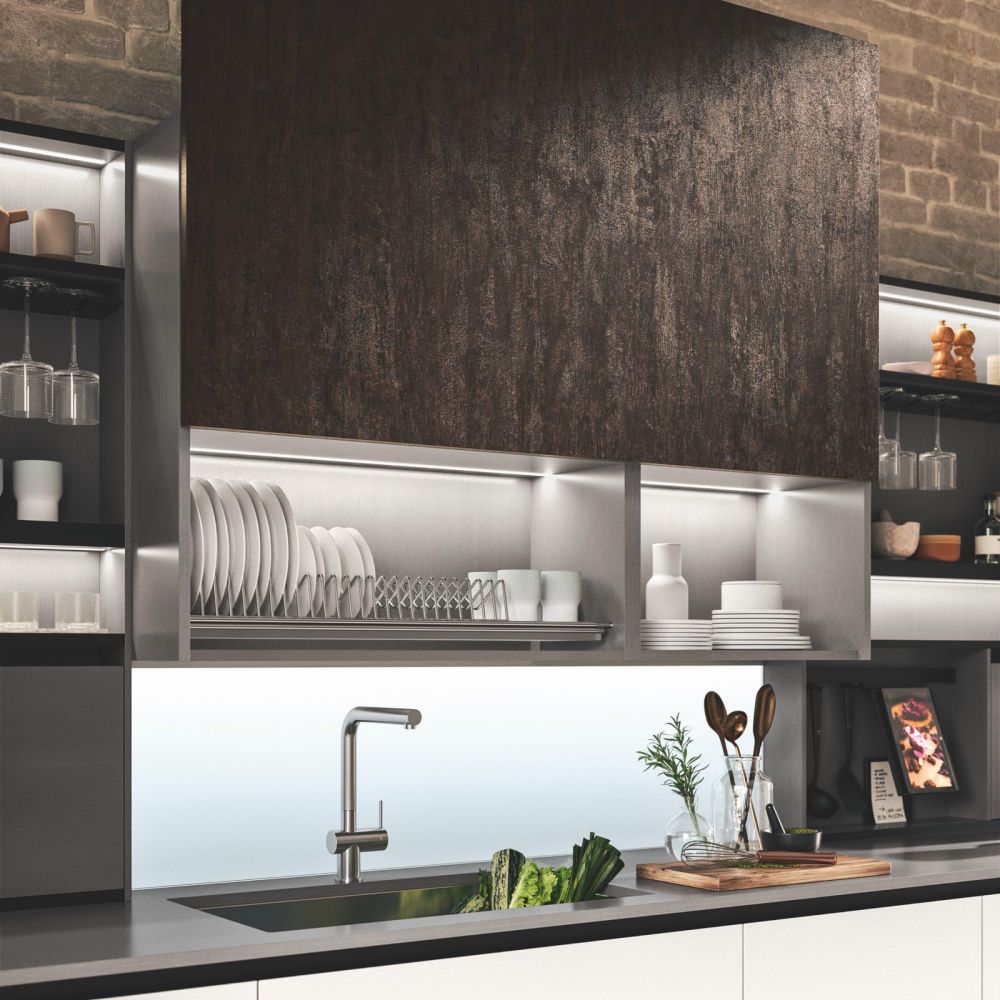By selecting the same finish as the fronts, the worktop surface may be customized, making the layout look cohesive. The area becomes the focal point of a series of solids and voids as a result of the monolith effect’s pure aesthetics, which also highlights the space’s crisp geometric lines.