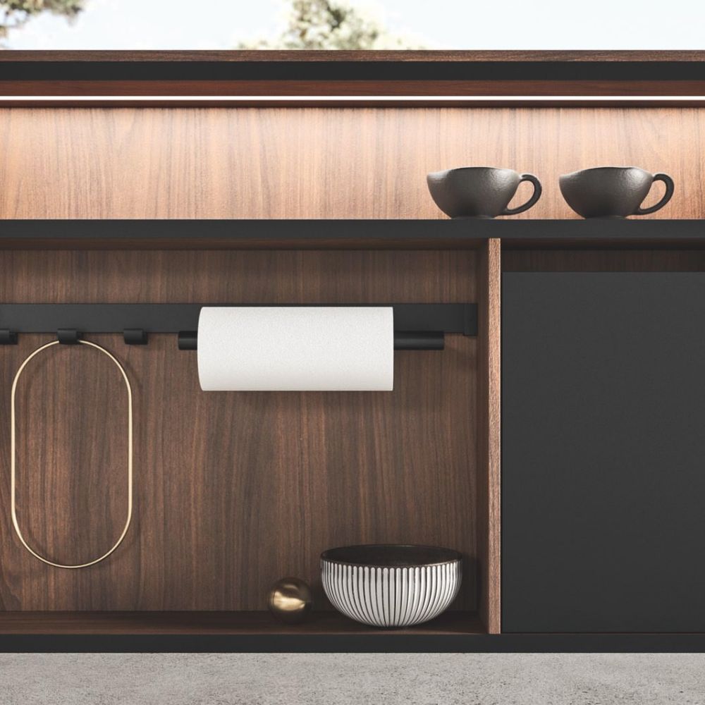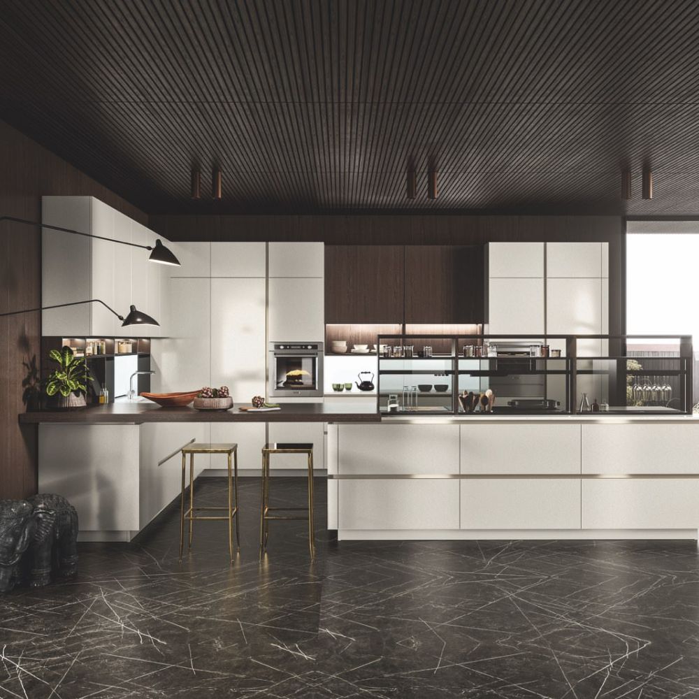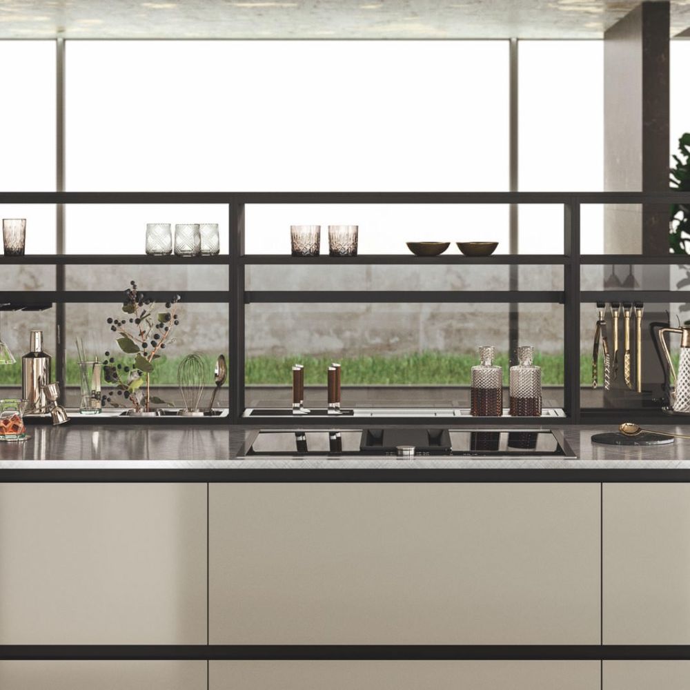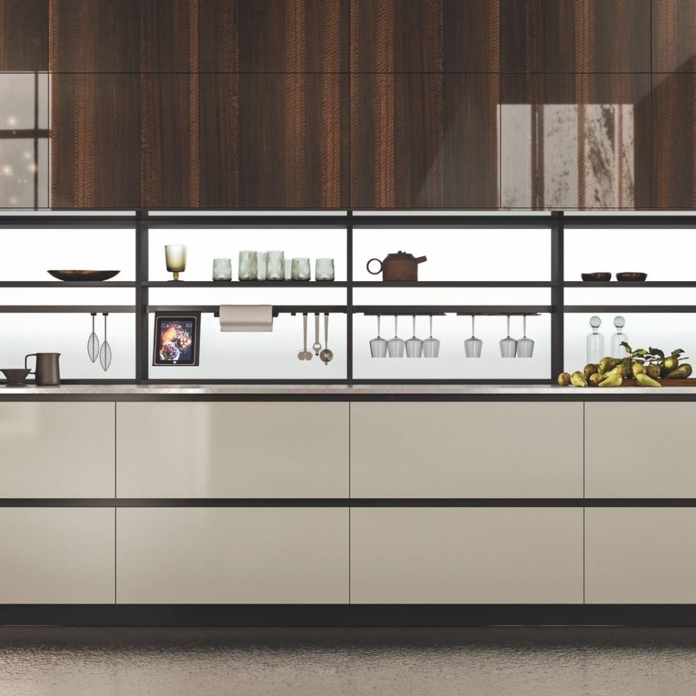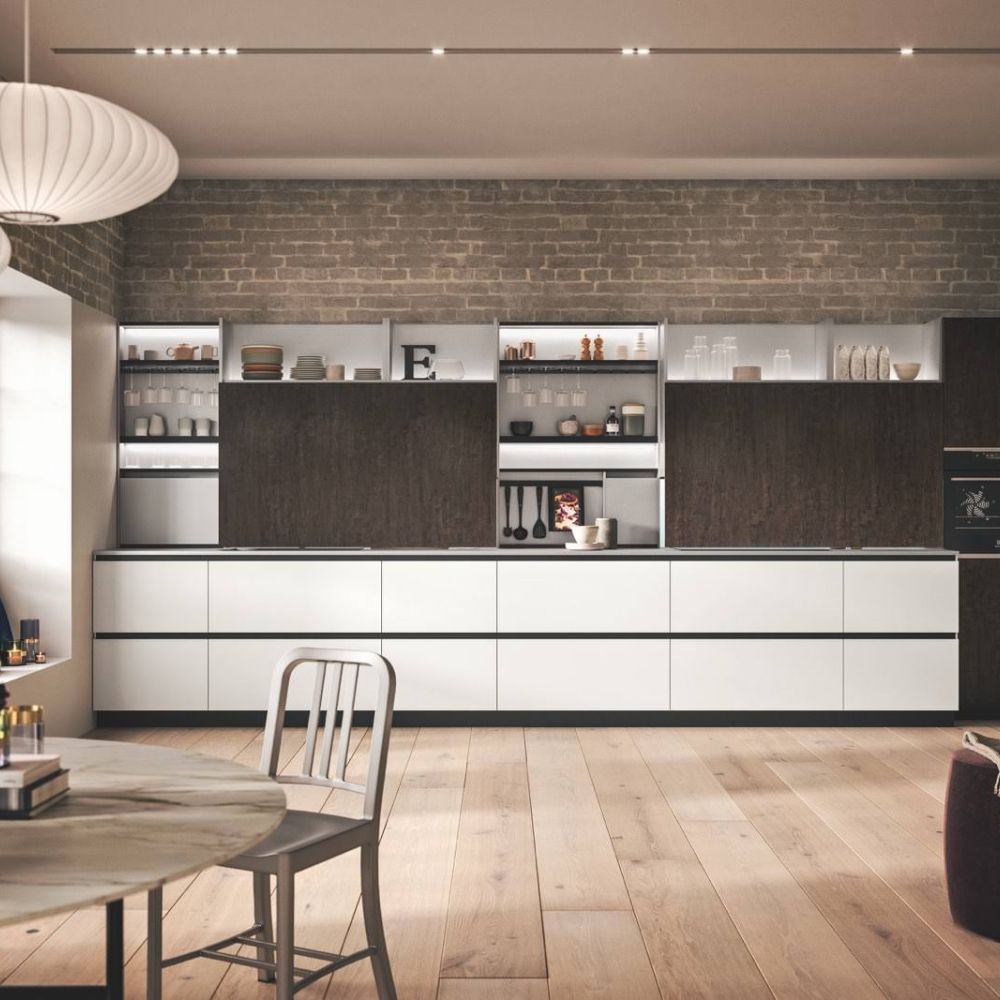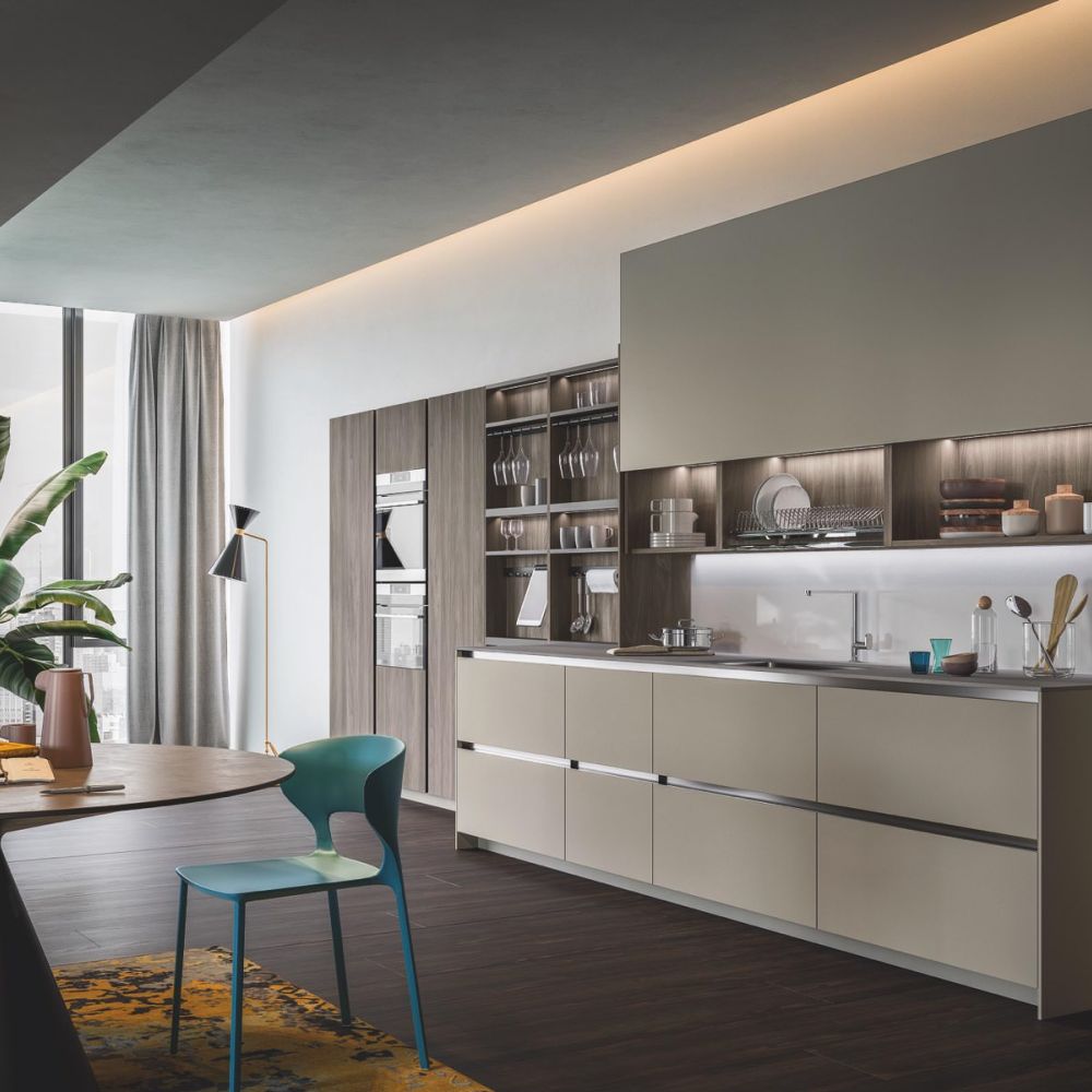 The kitchen has a creative dual solution for the door opening: using a flat or curved channel guarantees a highly functional aesthetic.